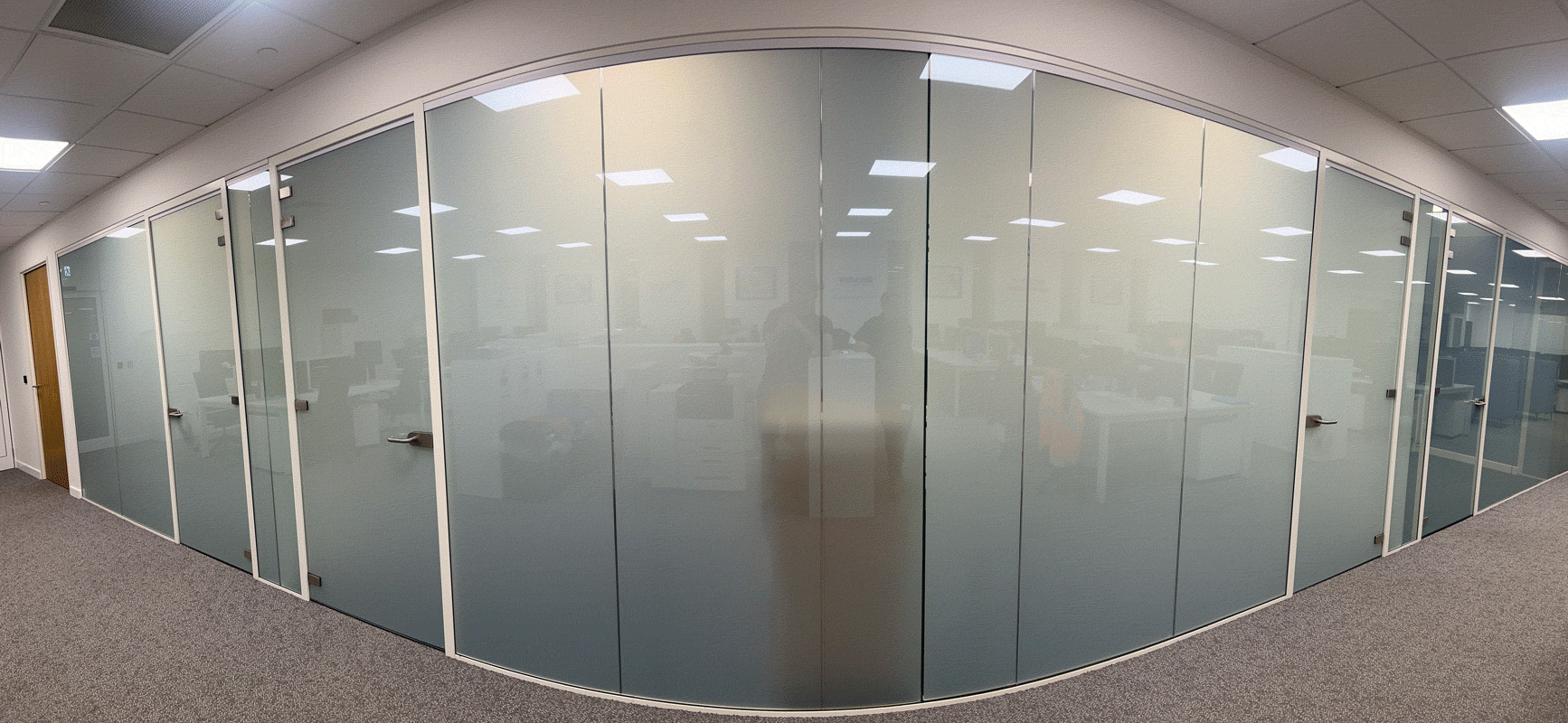 The four sections of 0.8 x 2.4m film are installed on the inside of the glass, and reduce glare and light transmittance by around 30%, ensuring a more comfortable environment, and provide complete privacy at the flick of a switch.