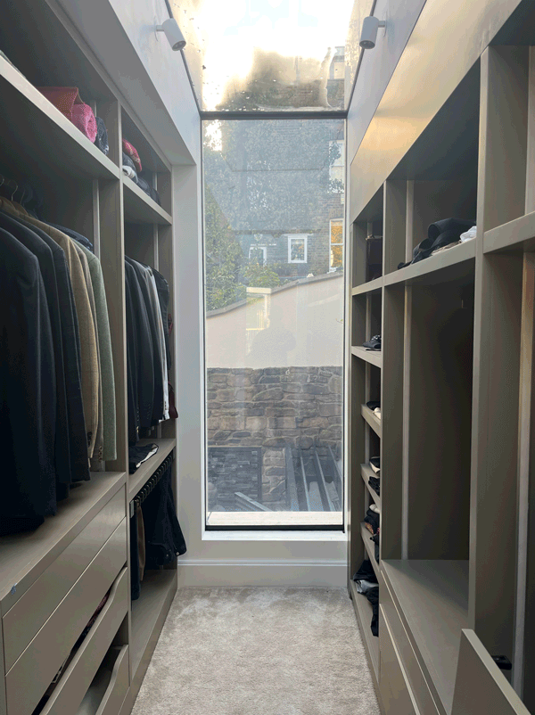 Switchable smart film is fitted to the glass in the walk-in wardrobe. When the switchable smart film is switched off it becomes frosted providing complete privacy, while still passing 60% of the light through. When the switchable smart film is switched on, it becomes transparent.