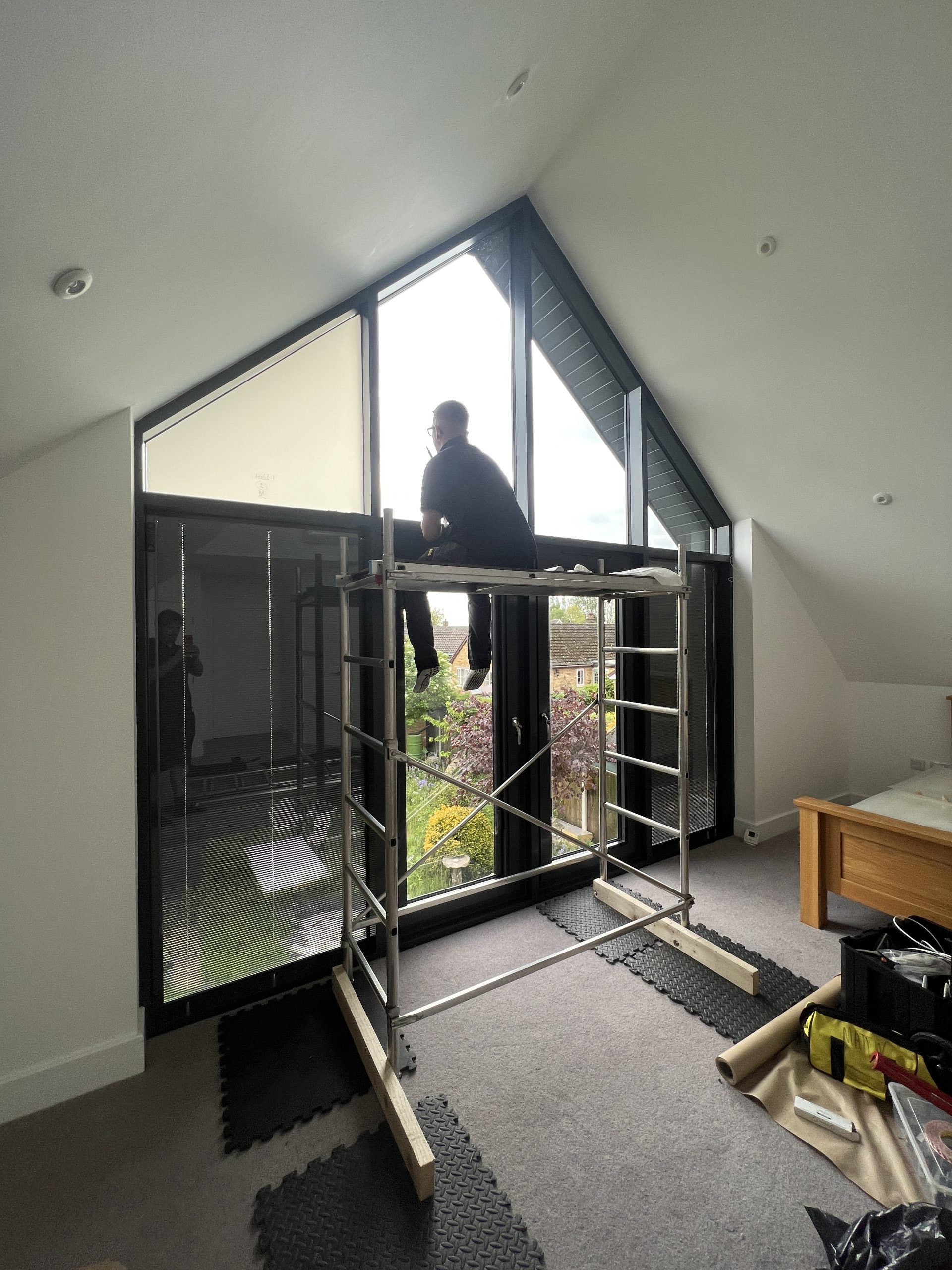Intelligent Glass have installed Switchable Smart Film on existing metal-framed windows in a bedroom overlooking a garden at a newly-refurbished residential property in Scunthorpe, UK. The switchable smart film is 0.45mm thick and has been cut to fit the irregular shape of the existing ‘raked’ windows. It is powered by a small, low-voltage electric current (0.1Â A/m2), supplied from an AC mains transformer. The film is switched using our RF remote control.
