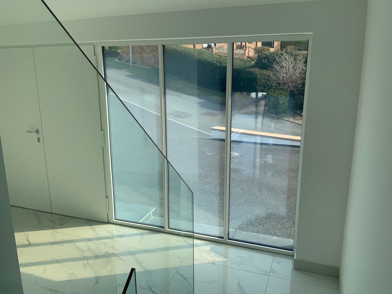 Whilst our previous projects speak for themselves, we don’t talk enough about how simple it can be to integrate this into your home. In this particular project, we supplied three pieces of our self-adhesive Switchable Film for installation into the entranceway of a residential property in Conwy, Wales. This modern home boasts three side-by-side glass panels creating a stunning almost 1914 x 1968mm space that floods light into the hallway. However, due to its location directly opposite the staircase, the owner sought after a solution that could offer privacy when needed without ruining this desirable architectural feature.