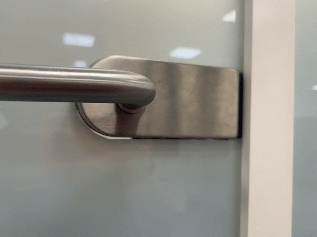 Our installers survey the property in advance, taking measurements for the film. Because our switchable film can be retro-fitted, no changes to the existing glass wall are necessary. During installation, the film shape is refined with scissors/blades for a perfect fit (e.g. around the door handles in the photos shown). The switchable smart film has a self-adhesive layer for convenient application. If the film is removed it does not leave any residue.