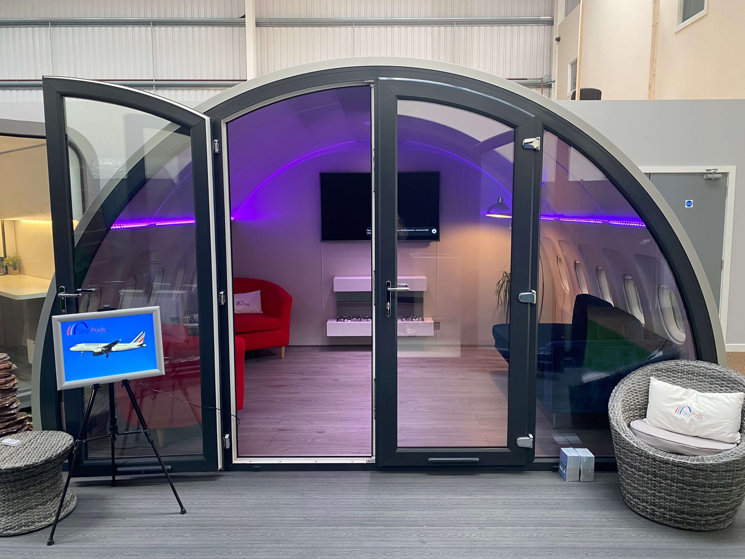 Intelligent Glass have recently been a part of an exciting custom project with local business SkyPods, also based in South Yorkshire, UK. SkyPods and their sister company FlyMe offer luxury, upcycled aircraft products as well as a one-of-a-kind virtual airport and flight simulator experience. Whilst sourcing parts to bring FlyMe to life, the idea of giving retired aircrafts a new lease of life was born leading to the creation of SkyPods with the CEO Andy Hyde saying: